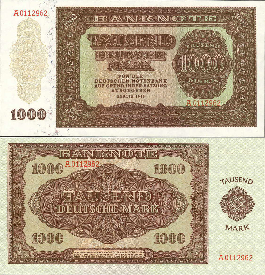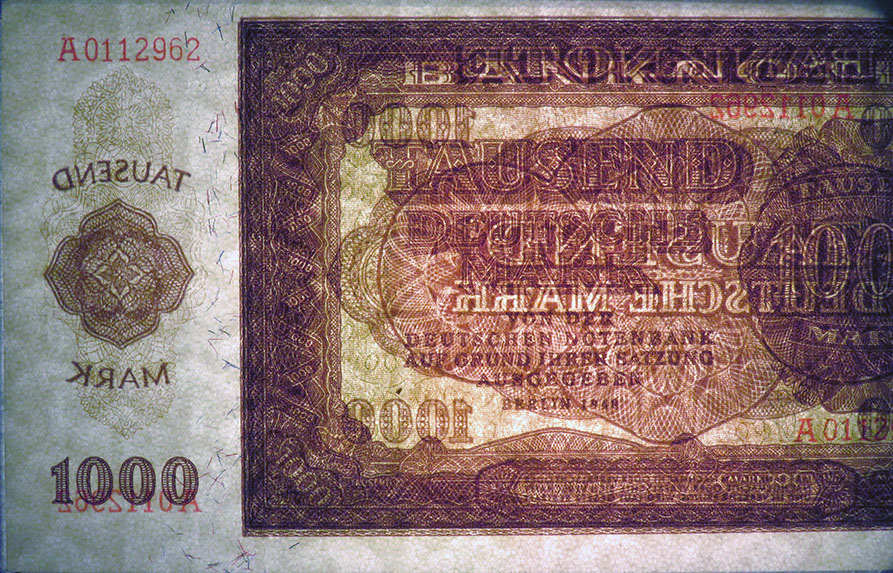 1000 Deutsche Mark; Grabowski SBZ-18 (347/P16); Vs. und Rs. Ornamente; Wz.: Pfeilspitzen; KN 7-stellig rot |
