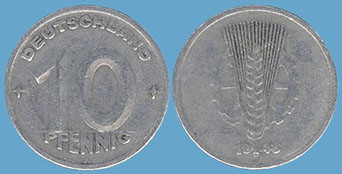10 Pfennig; 1948; Schön 3.a; Vs.: 10 / PFENNIG / Prägestätte und oben umlaufend: + DEUTSCHLAND +; Rs.: Ähre vor einem Zahrad und darunter die Jahreszahl; Glatter Rand; Aluminium; Dm=21,0mm; Gewicht=1,48g; Prägestätte A (Münze Berlin) |