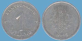 1 Pfennig; 1948; Schön 1.a; Vs.: 1 / PFENNIG und oben umlaufend: + DEUTSCHLAND +; Rs.: Ähre vor einem Zahrad und darunter die Jahreszahl; Glatter Rand; Aluminium; Dm=17,0mm; Gewicht=0,73g; Prägestätte A (Münze Berlin) |