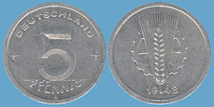 5 Pfennig; 1948; Schön 2.a; Vs.: 5 / PFENNIG / Prägestätte und oben umlaufend: + DEUTSCHLAND +; Rs.: Ähre vor einem Zahrad und darunter die Jahreszahl; Glatter Rand; Aluminium; Dm=19,09mm; Gewicht=1,07g; Prägestätte A (Münze Berlin) |