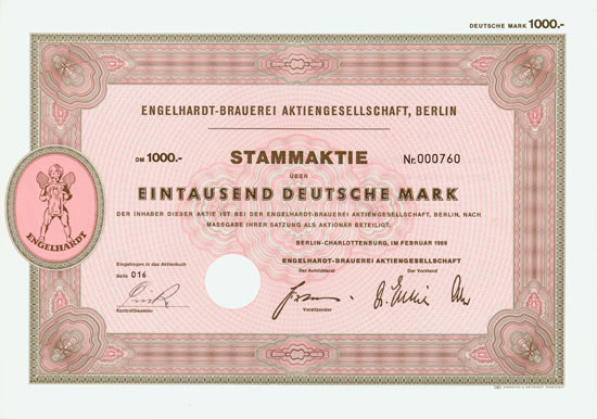 1.000 DM; Stammaktie; ausgestellt in Berlin-Charlottenburg, im Februar 1969; nicht katalogisiert; Wasserzeichen: ; rückseitig entwertet |