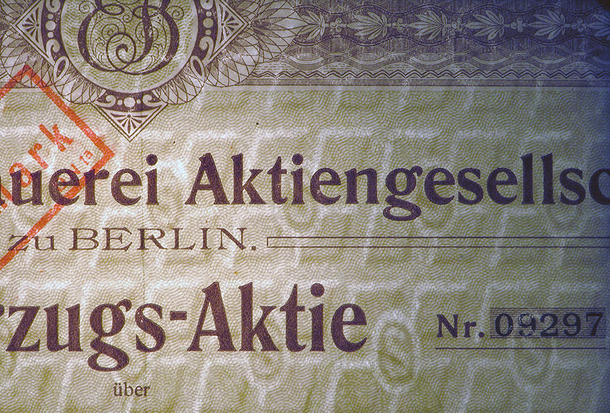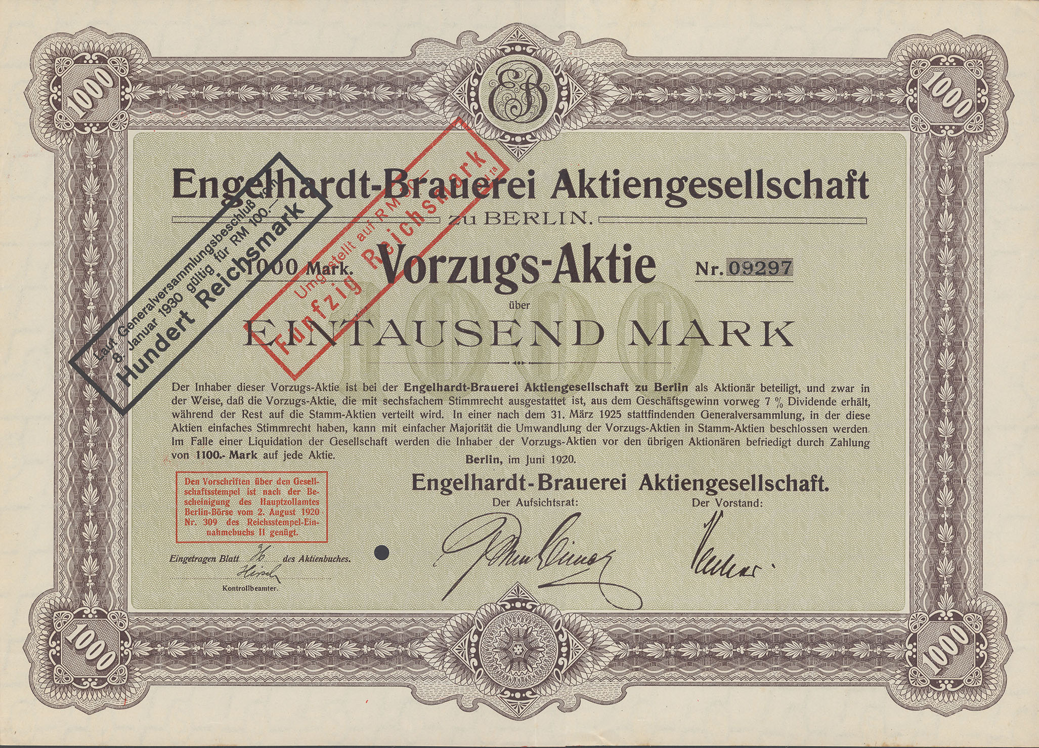 1.000 RM; Vorzugs-Aktie; ausgestellt in Berlin, im Juni 1920; SUPPES 2005/06-6195; Wasserzeichen: S-S-Muster; lochentwertet |
