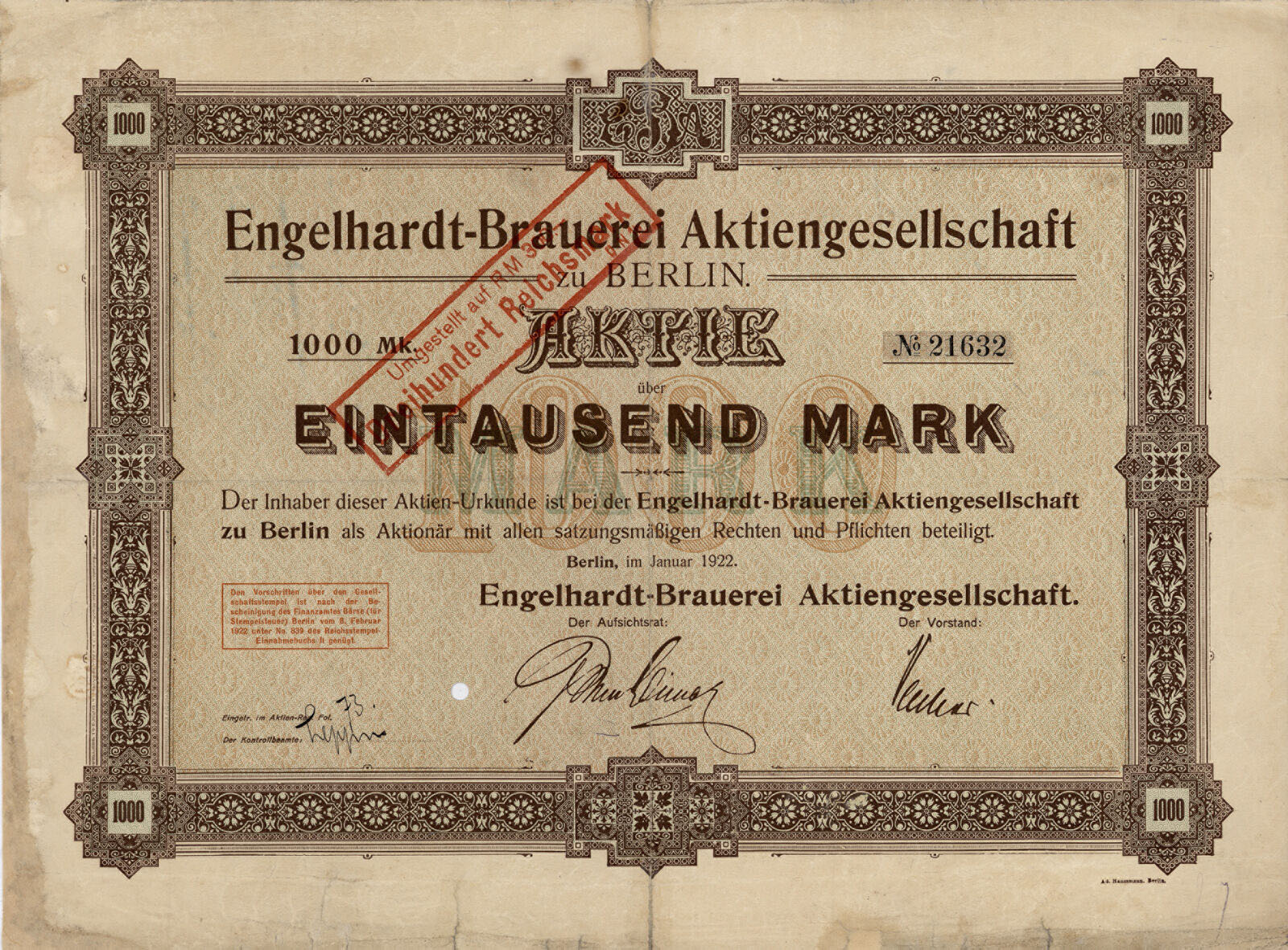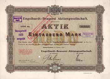 • gegründet 1860 auf der Halbinsel Stralau • 1905 Bau eines neuen Werkes in Pankow • AG seit dem 31.10.1907 als "Brauerei Ernst Engelhardt Nachf. AG, Berlin-Pankow" • Am 1.12.1917 Umbenennung in Engelhardt-Brauerei AG • viele Niederlagen in ganz Deutschland, u.a. auch in Angermünde • Zu DDR-Zeiten stärkste Brauerei in Ost-Berlin • 1983 Übernahme durch die Schuldheiss-Brauerei • 1998 endgültige Schließung ![]() Prenzlauer Straße Ecke Berliner Straße ![]() ![]() ![]() Werbemarken |