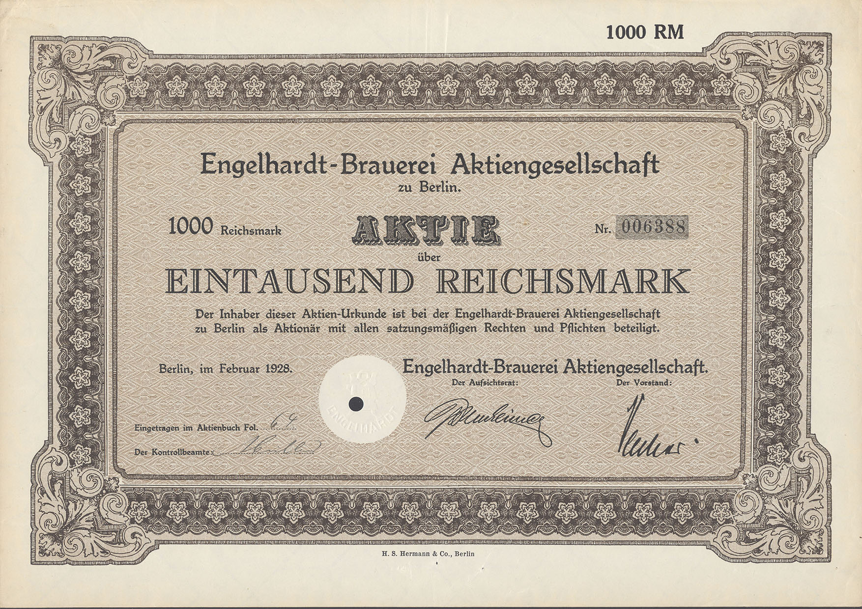 1.000 RM; ausgestellt in Berlin, im Februar 1928; SUPPES 2005/06-6197; Wasserzeichen: ; lochentwertet; Drfa.: H.S. Hermann & Co., Berlin |