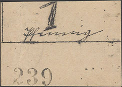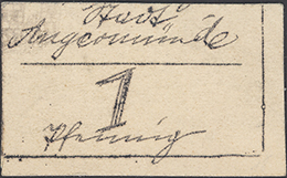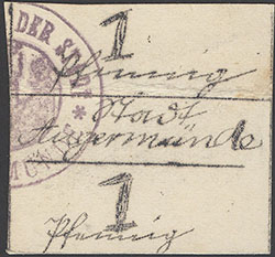 1 Pfennig-Seite ohne Datum (1920); nicht katalogisiert; Beschreibung pro Pfennig wie Keller 41 I; Karton; handschriftlich ausgeführt; entwertet mit rotem Strich |