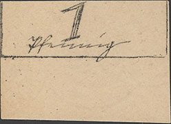 1 Pfennig ohne Datum (1920); nicht katalogisiert; Beschreibung pro Pfennig wie Keller 41 I und II; Karton; handschriftlich ausgeführt; Eckstück unten links; mit Seiten-Nr.; falsch abgetrennt |