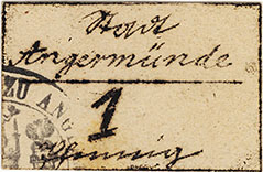1 Pfennig ohne Datum (1920); Geiger 41 I; Karton; schwarzer, runder Wappenst. Kämmerei-Kasse zu Angermünde; handschriftlich ausgeführt; Unterschiede in Schrift und WZ; Eckstück unten rechts; falsch abgetrennt |