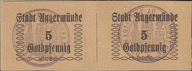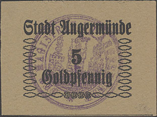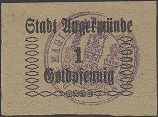 1 Pfennig ohne Datum (1920); Geiger 41 II; Karton; violetter, runder Wappenst. Sparkasse der Stadt Angermünde; handschriftlich ausgeführt; Unterschiede in Schrift und WZ; falsch abgetrennt |