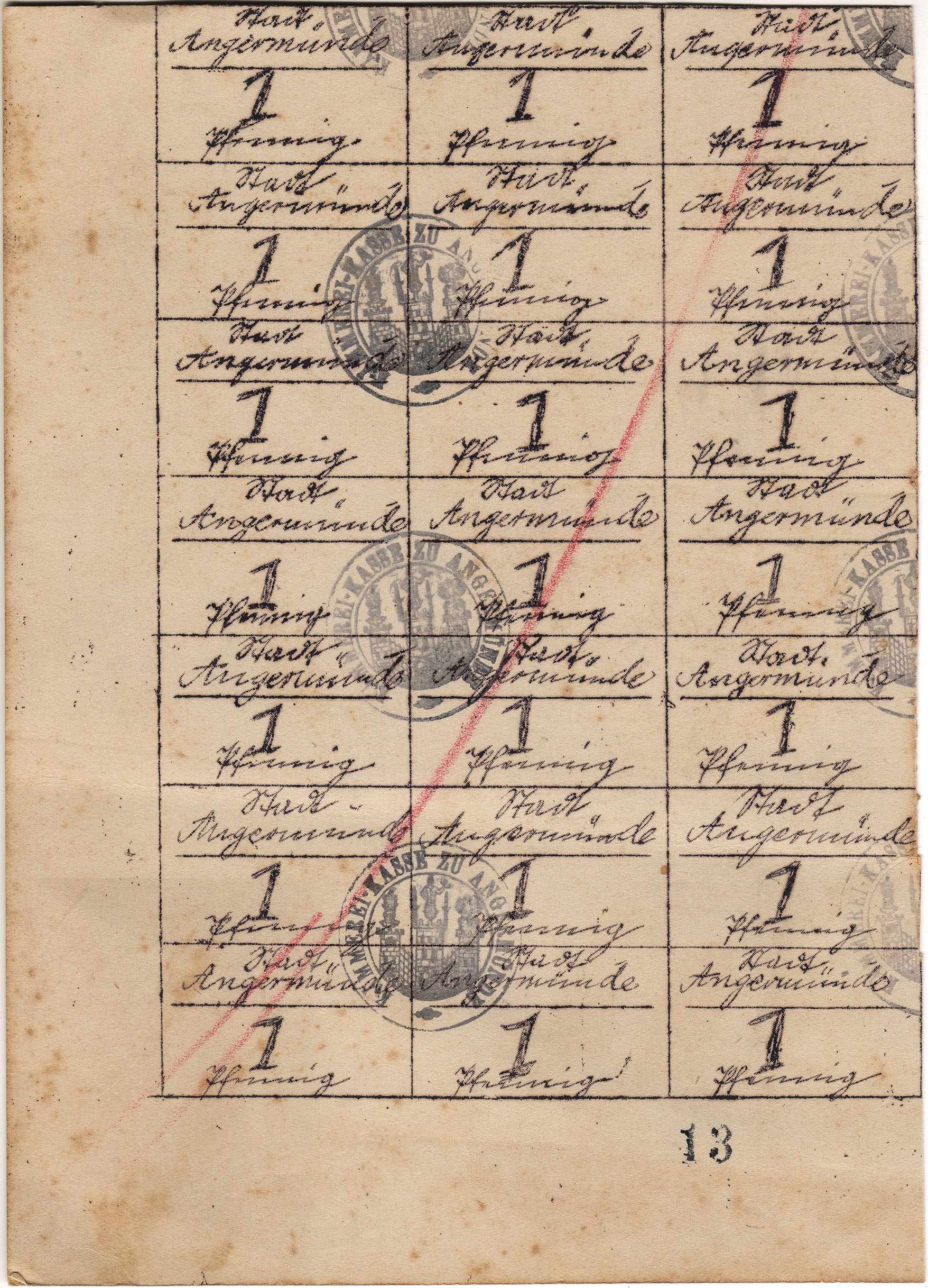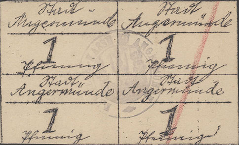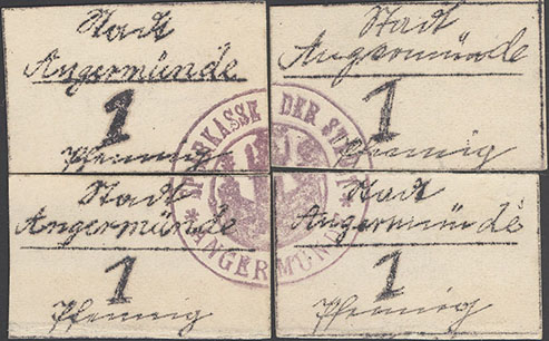 1 Pfennig ohne Datum (1920); Geiger 41 I; Karton; schwarzer, runder Wappenst. Kämmerei-Kasse zu Angermünde; Viererblock; handschriftlich ausgeführt; Unterschiede in Schrift und WZ; entwertet mit rotem Strich |