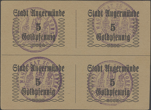 1 Pfennig ohne Datum (1920); Geiger 41 II; Karton; violetter, runder Wappenst. Sparkasse der Stadt Angermünde; Viererblock; handschriftlich ausgeführt; Unterschiede in Schrift und WZ; entwertet mit rotem Strich |