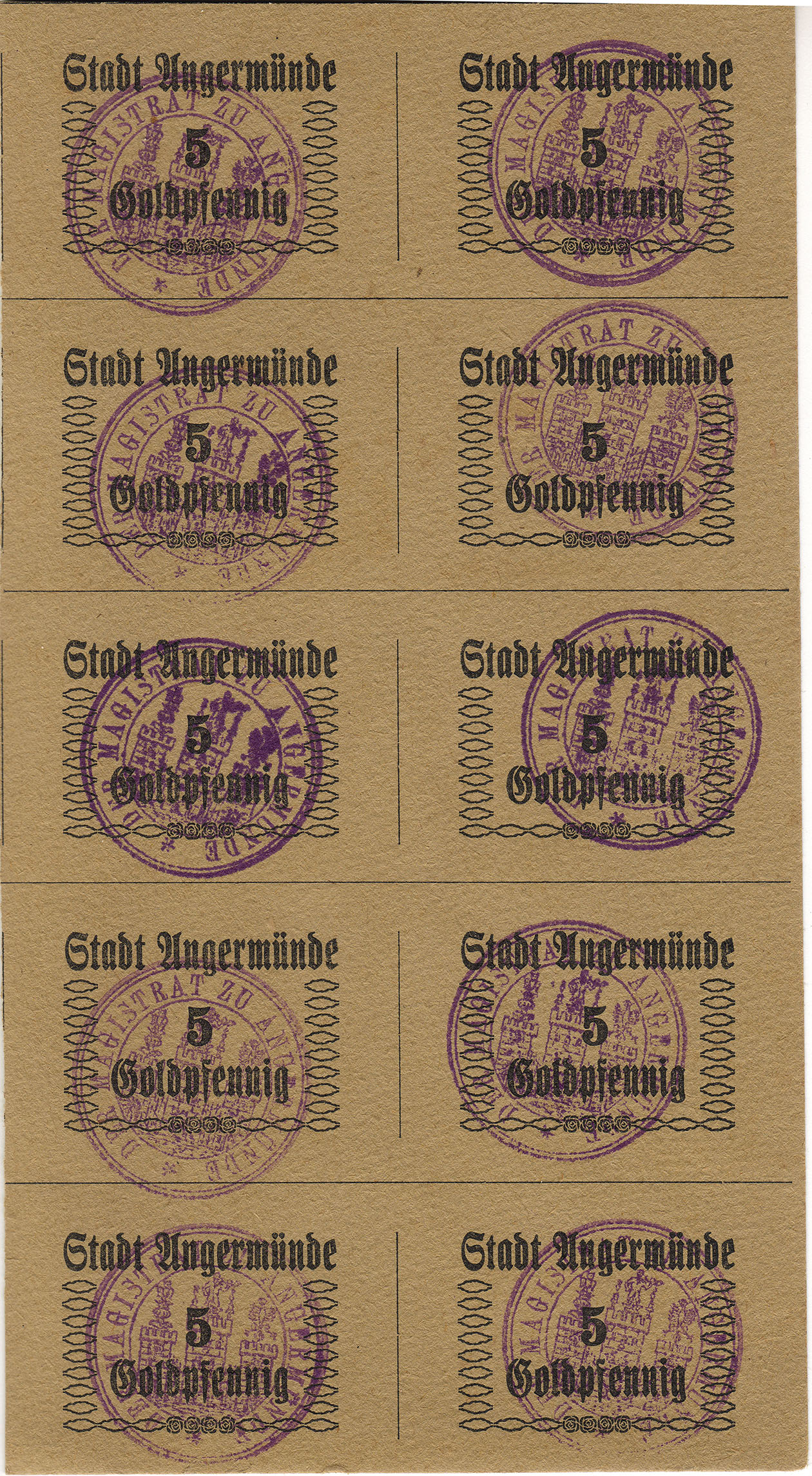 5 Goldpfennig ohne Datum; nicht katalogisiert; Karton; im Stempel äußerer Kreis doppelt; Bogen mit 10 Scheinen |