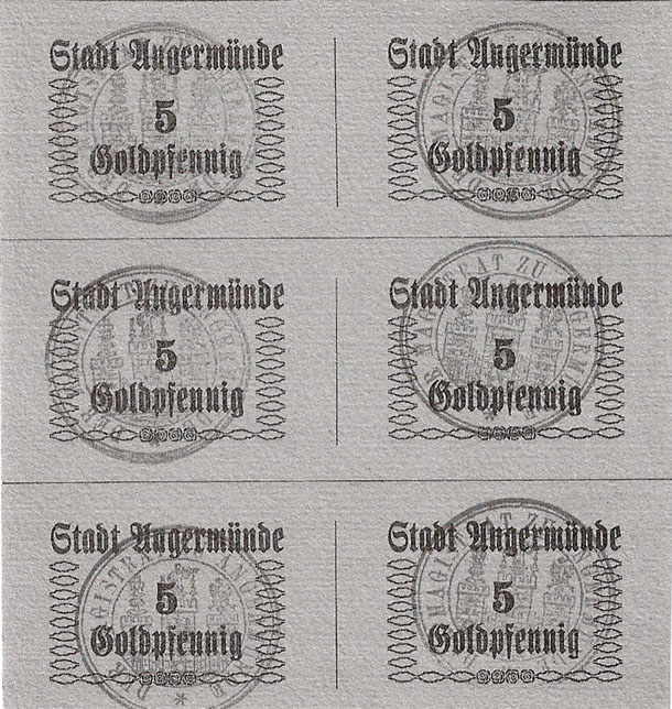 5 Goldpfennig ohne Datum; Lindmann A016.4.8; Karton; im Stempel äußerer Kreis doppelt; Bogen mit 6 Scheinen |