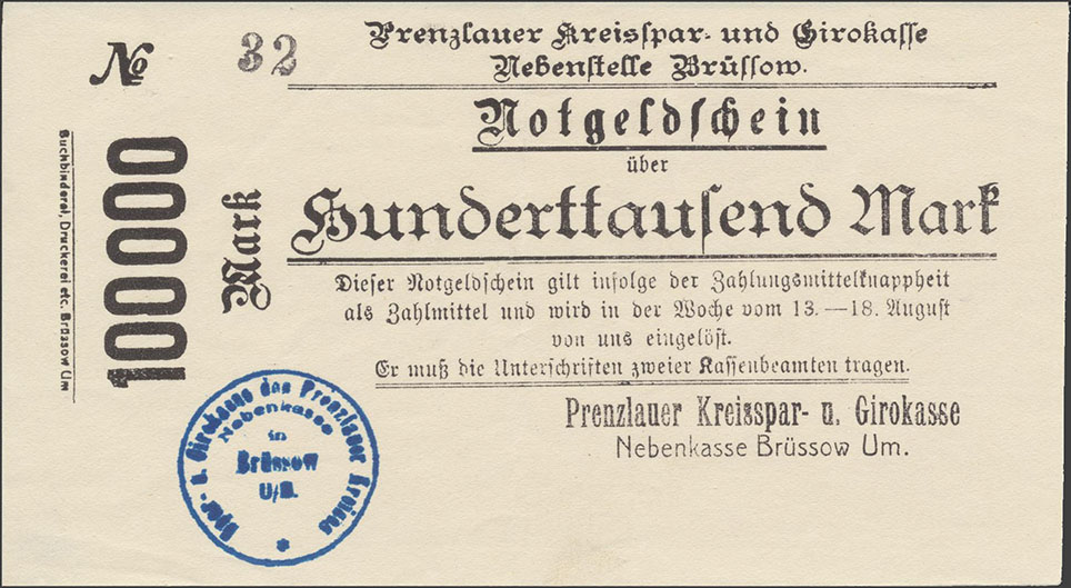 100.000 Mark; 13.-18.08.1923; nicht katalogisiert; Vs.: 100000 Mark, Stempel der Prenzlauer Kreisspar- und Girokasse, Nebenstelle Brüssow; Rs. leer; ohne Wz.; KN 2-stellig; Drfa.: Druckerei Brüssow Um |