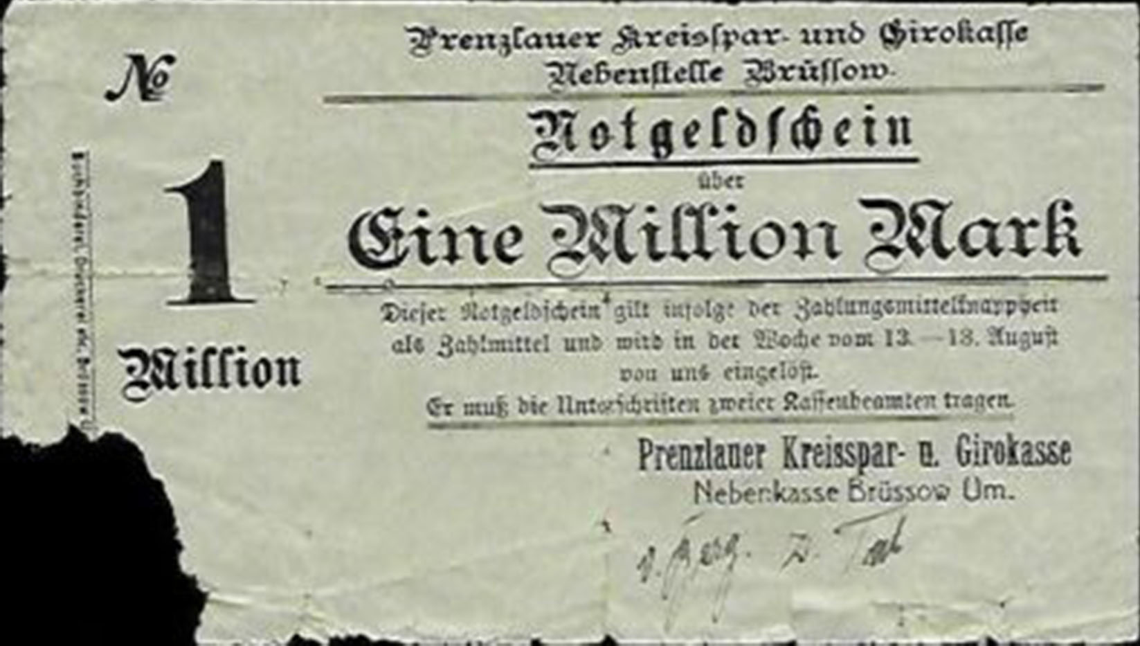 1.000.000 Mark; 13.-18.08.1923; nicht katalogisiert; Vs.: 1.000000 Mark, Prenzlauer Kreisspar- und Girokasse, Nebenstelle Brüssow; Rs. leer; ohne Wz.; ohne KN; Drfa.: Druckerei Brüssow Um |
