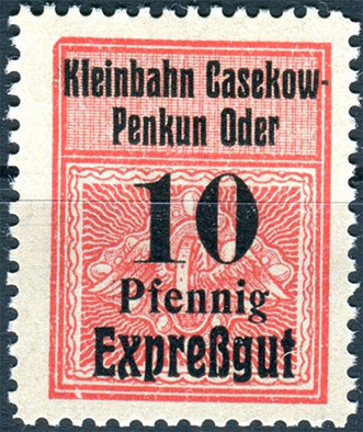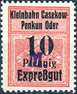 10 Pfennig; 1907; 1922 "M." überstempelt; nicht katalogisiert; Vs.: "Kleinbahn Casekow-Penkun Oder 10 Pfennig Expresgut"; Rs.: leer; Farbe: rot |