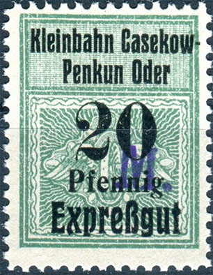 20 Pfennig; 1907; 1922 "M." überstempelt; nicht katalogisiert; Vs.: "Kleinbahn Casekow-Penkun Oder 10 Pfennig Expresgut"; Rs.: leer; Farbe: grün |