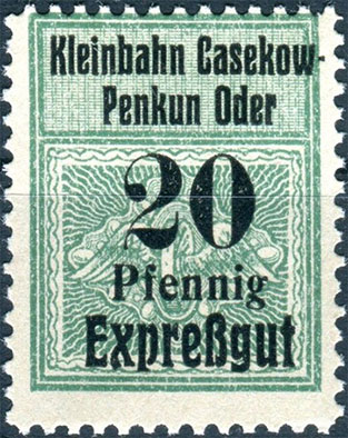 20 Pfennig; 1907; nicht katalogisiert; Vs.: "Kleinbahn Casekow-Penkun Oder 10 Pfennig Expresgut"; Rs.: leer; Farbe: grün |