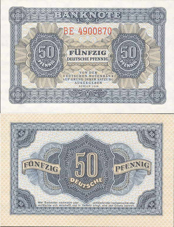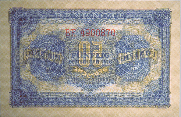 50 Deutsche Pfennig; Grabowski DDR-1b (339/P8.b); Vs. und Rs.: Ornamente, Offsetdruck; Wz.: Wabengitter; KN 7-stellig rot |
