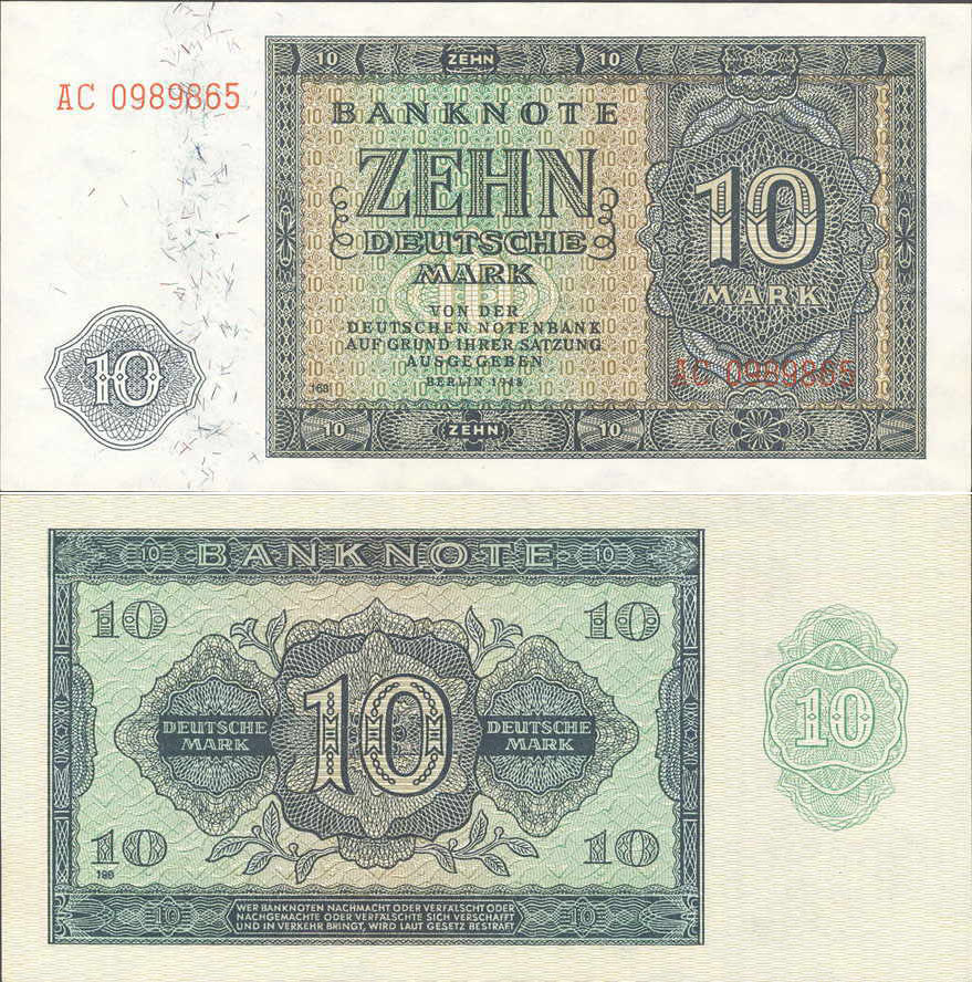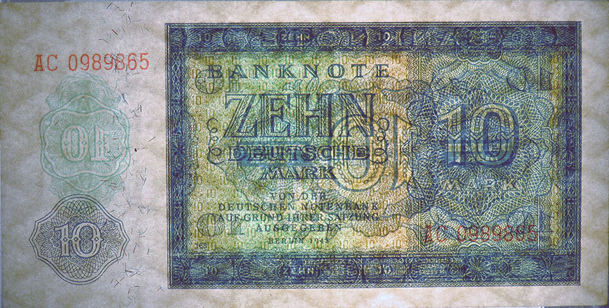 10 Deutsche Mark; Grabowski DDR-5 (343/P12); Vs. und Rs.: Ornamente, Buchdruck; Wz.: Pfeilspitzen; KN 7-stellig rot |
