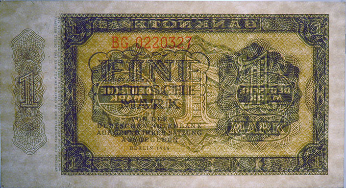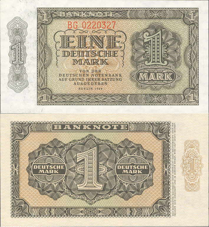 1 Deutsche Mark; Grabowski DDR-2b (340/P9.b); Vs. und Rs.: Ornamente, Buchdruck; Wz.: Wabengitter; KN 7-stellig rot |