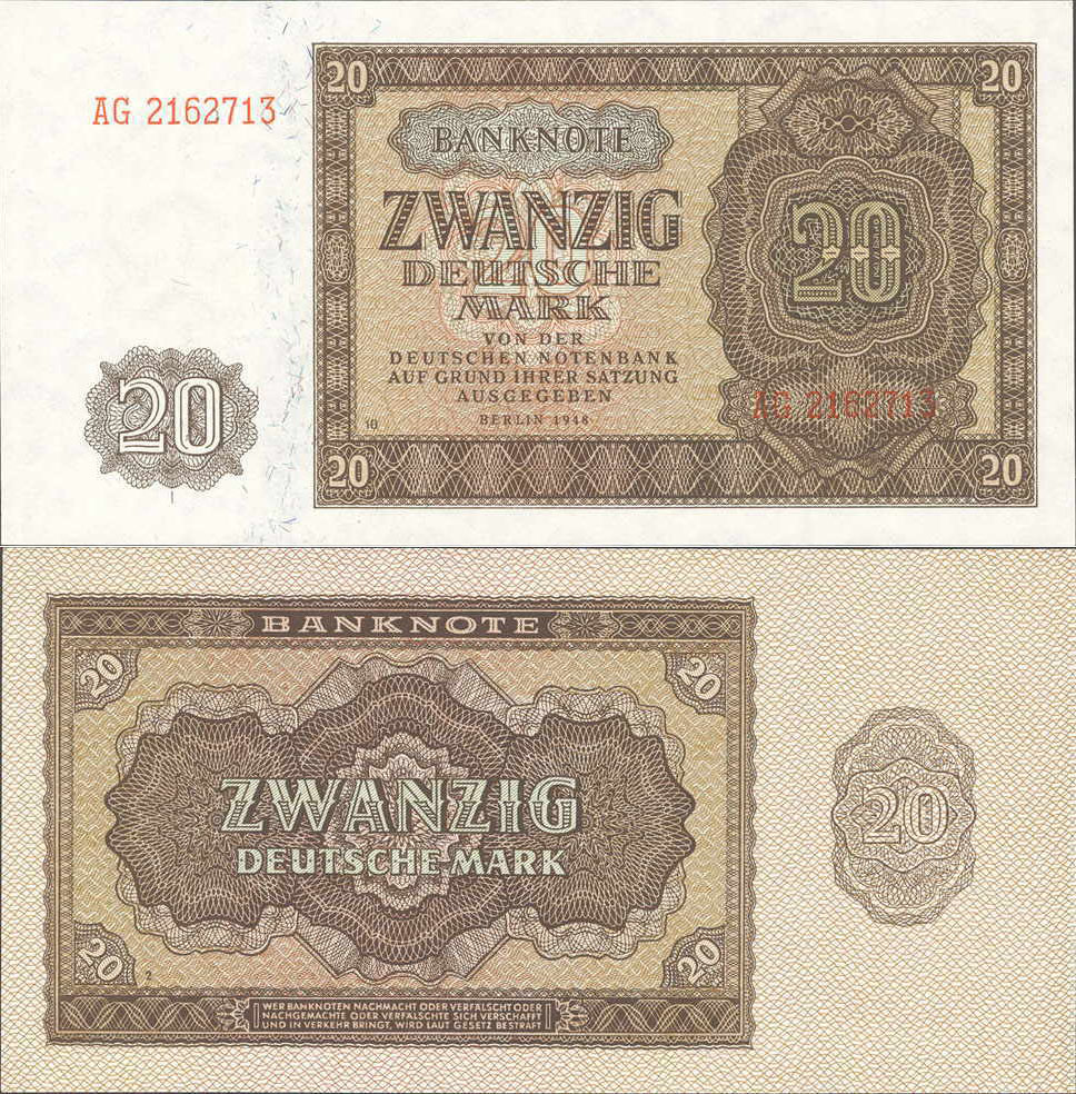 20 Deutsche Mark; Grabowski DDR-6 (344/P13); Vs. und Rs.: Ornamente, Buchdruck; Wz.: Pfeilspitzen; KN 7-stellig rot |