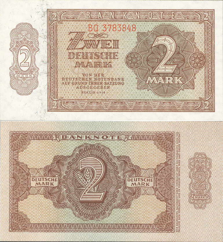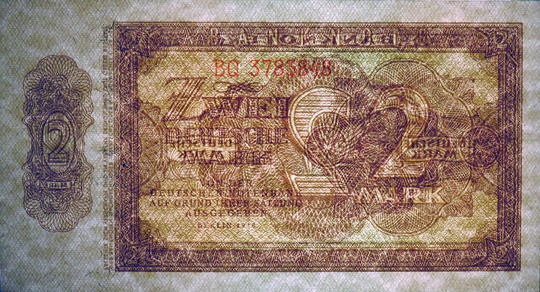 2 Deutsche Mark; Grabowski DDR-3b (341/P10.b); Vs. und Rs.: Ornamente, Buchdruck; Wz.: Wabengitter; KN 7-stellig rot |