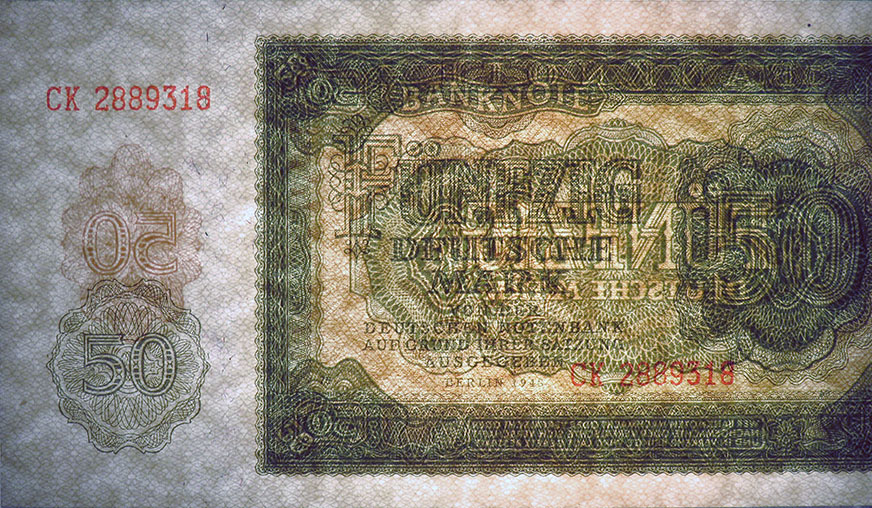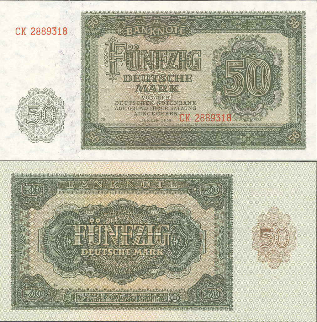 50 Deutsche Mark; Grabowski DDR-7 (345/P14.a); Vs. und Rs.: Ornamente; Wz.: Pfeilspitzen; KN 7-stellig rot |