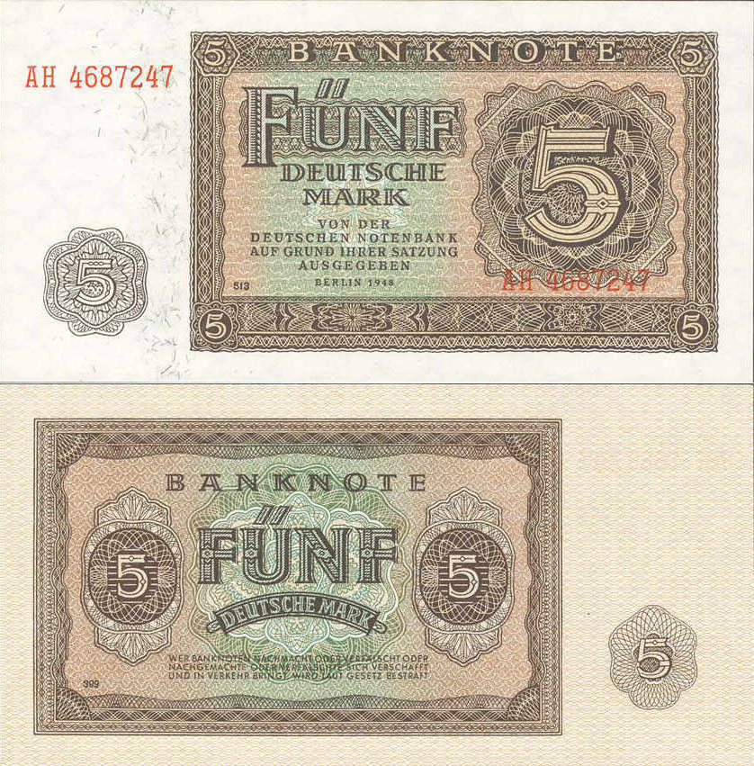 5 Deutsche Mark; Grabowski DDR-4a (342/P11.a); Vs. und Rs.: Ornamente, Buchdruck; Wz.: Wabengitter; KN 7-stellig rot |