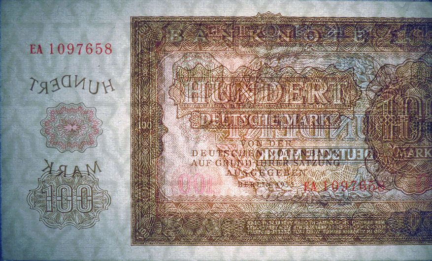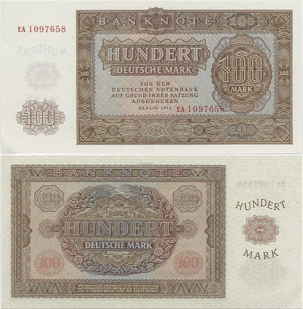 100 Deutsche Mark; Grabowski DDR-15a (353/P21.a); Vs. und Rs. Ornamente; Wz.: Dornzacken; Kn.: 7-stellig, rot |