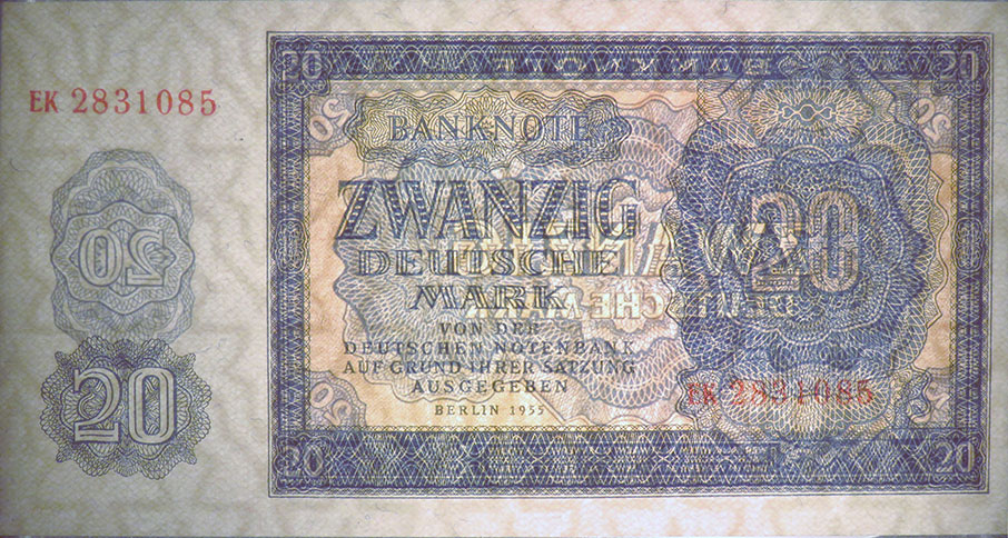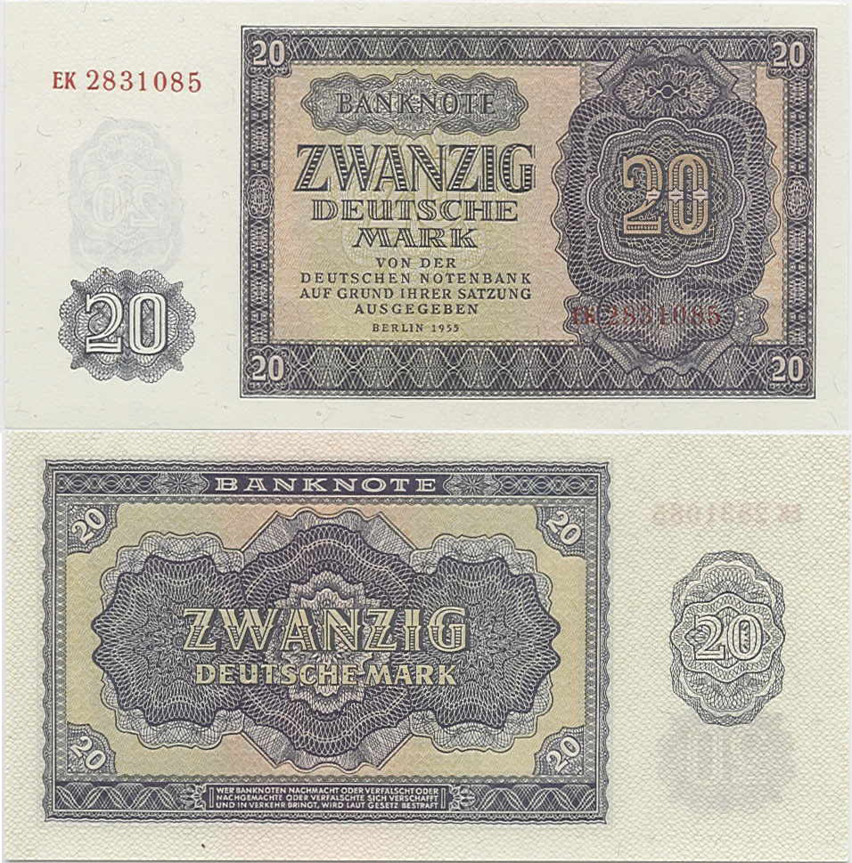20 Deutsche Mark; Grabowski DDR-13a (351/P19.a); Vs. und Rs. Ornamente; Wz.: Dornzacken; Kn.: 7-stellig, rot |