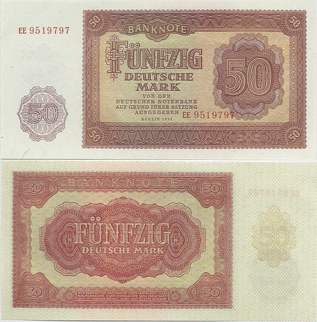 50 Deutsche Mark; Grabowski DDR-14a (352/P20.a); Vs. und Rs. Ornamente; Wz.: Dornzacken; Kn.: 7-stellig, rot |