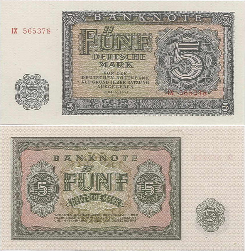 5 Deutsche Mark; Grabowski DDR-11a (349/P17.a); Vs. und Rs. Ornamente; Wz.: Bogenschuppen; Kn.: 6-stellig, rot |
