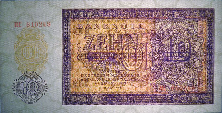 10 Deutsche Mark; Grabowski DDR-12a (350/P18.a); Vs. und Rs. Ornamente; Wz.: Bogenschuppen; Kn.: 6-stellig, rot |