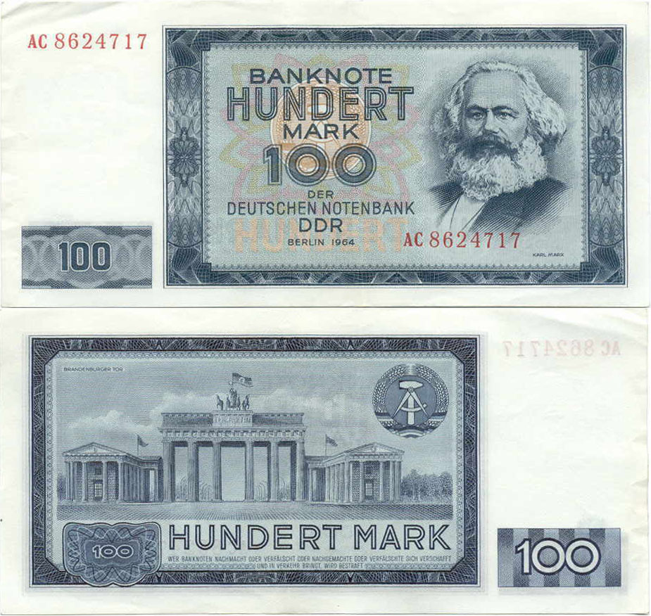 100 Mark der Deutschen Notenbank; Grabowski DDR-20a (358/P26.a); Vs.: Karl Marx, Mitte Udr. Wappen der DDR; Rs.: Brandenburger Tor und Wappen der DDR; Wz.: Kopf Marx; Kn.: 7-stellig, rot |