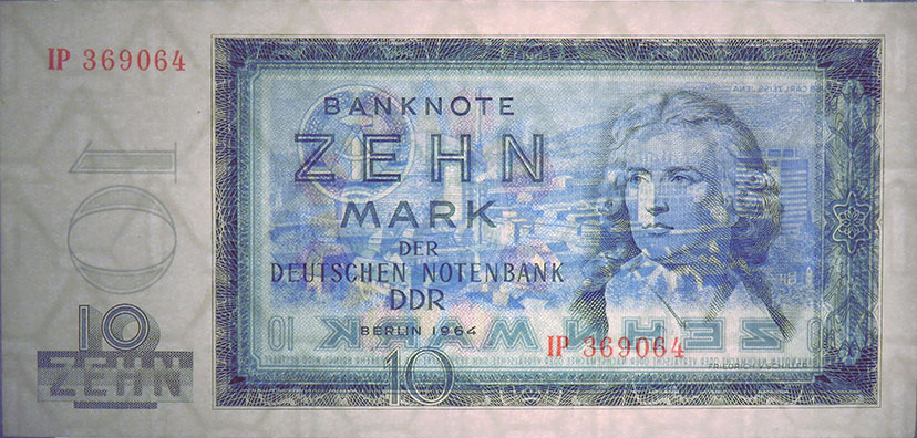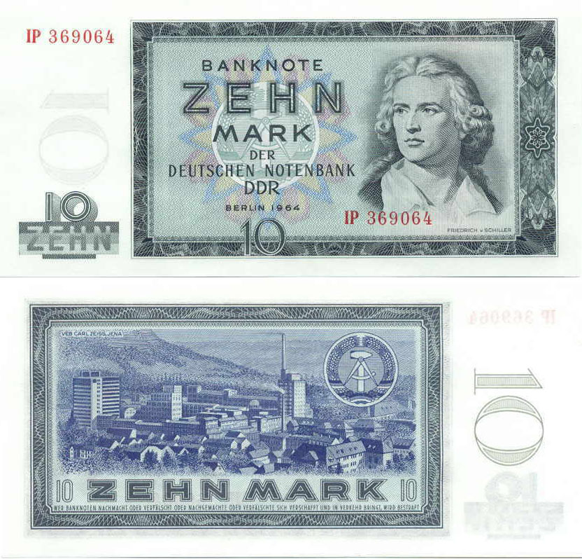 10 Mark der Deutschen Notenbank; Grabowski DDR-17a (355/P23.a); Vs.: Friedrich von Schiller, Mitte Udr. Wappen der DDR; Rs.: Zeiss-Werke in Jena und Wappen der DDR; Wz.: Hammer und Zirkel; Kn.: 6-stellig, rot |
