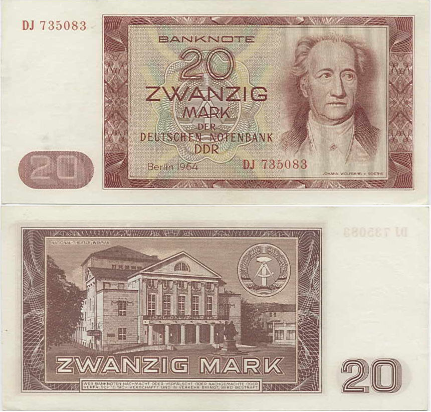 20 Mark der Deutschen Notenbank; Grabowski DDR-18a (356/P24.a); Vs.: Johann Wolfgang von Goethe, Mitte Udr. Wappen der DDR; Rs.: Nationaltheater in Weimar und Wappen der DDR; Wz.: Kopf Goethe; Kn.: 6-stellig, rot |