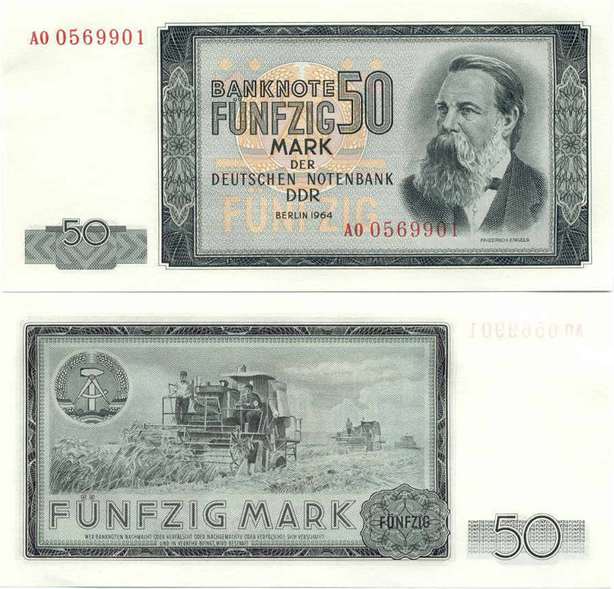 50 Mark der Deutschen Notenbank; Grabowski DDR-19a (357/P25.a); Vs.: Friedrich Engels, Mitte Udr. Wappen der DDR; Rs.: Mähdrescher bei der Ernte und Wappen der DDR; Wz.: Kopf Engels; Kn.: 7-stellig, rot |
