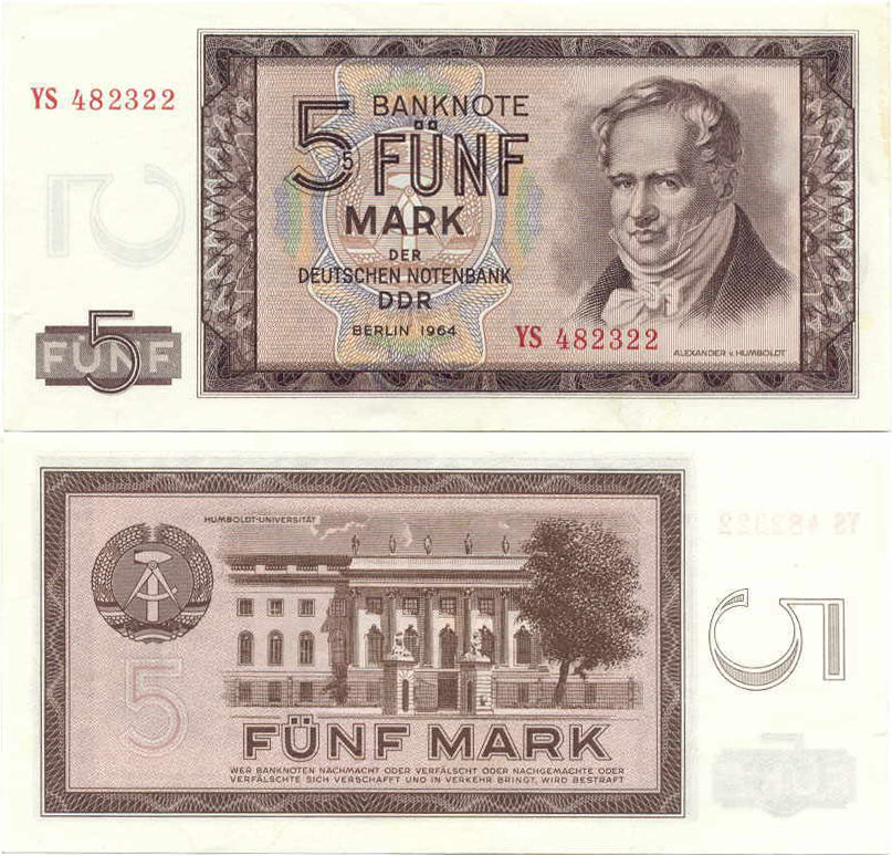 5 Mark der Deutschen Notenbank; Grabowski DDR-16b (354/P22.b); Vs.: Alexander von Humboldt, Mitte Udr. Wappen der DDR; Rs.: Humboldt-Universität in Berlin und Wappen der DDR; Wz.: Hammer und Zirkel; Kn.: 6-stellig, rot |