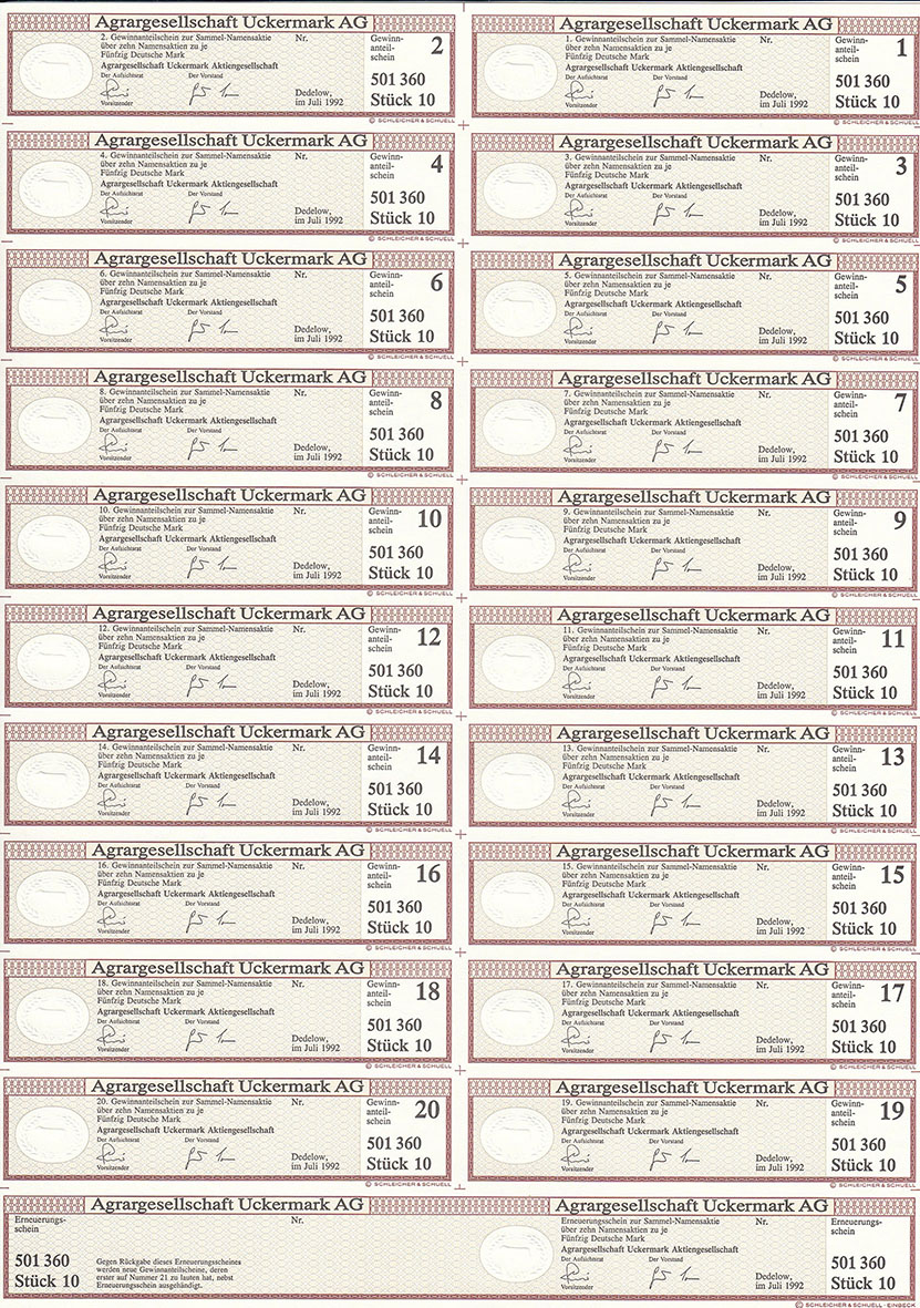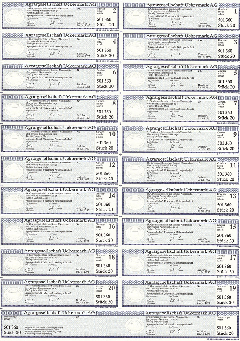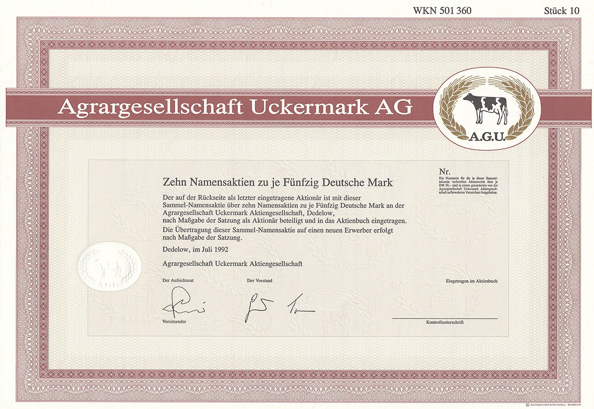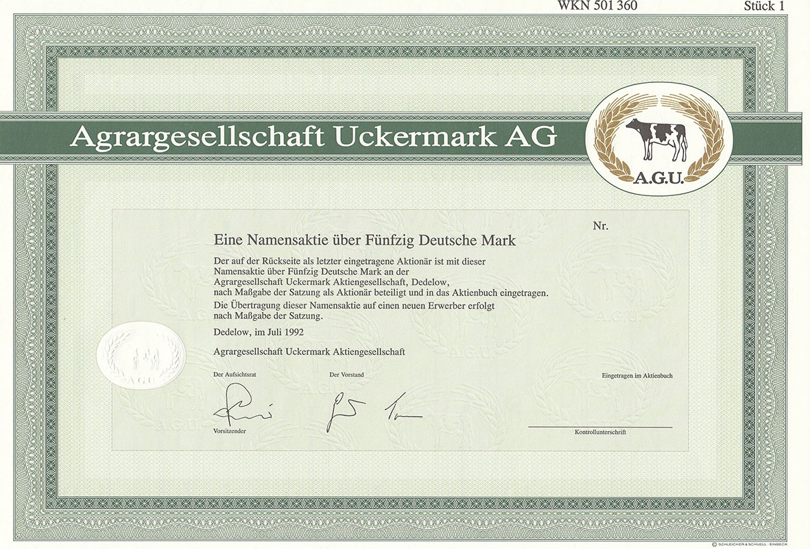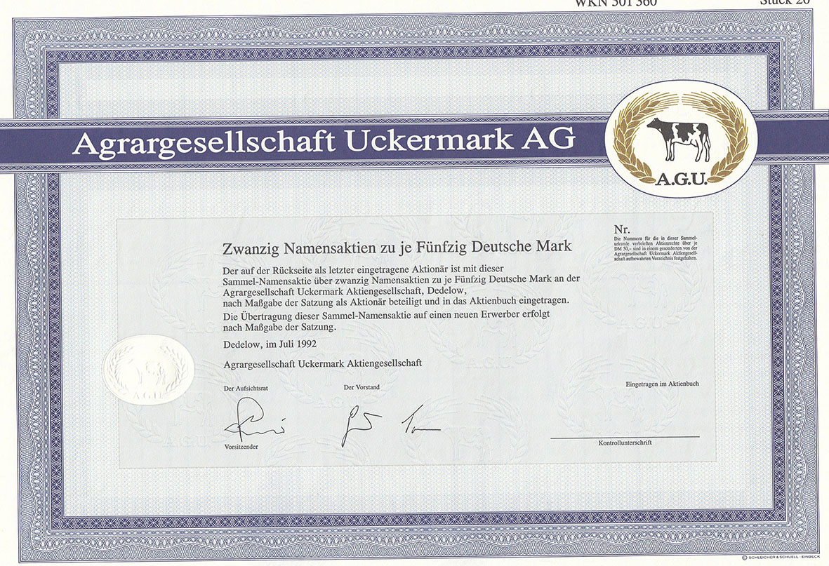 1 Namensaktie über 50 DM; ausgestellt in Dedelow, im Juli 1992; nullgeziffertes Muster, R10; nicht katalogisiert; Vs.: Vignette mit Kuh im Ehrenkranz; Rs.: Eintrsgungen im Aktienbuch; Farbe: grün; Drfa. unten rechts |