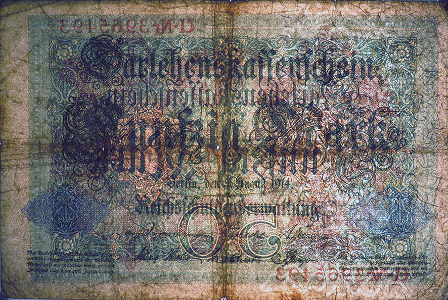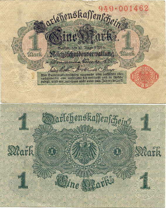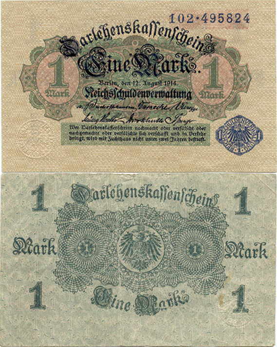 1 Mark; 12.8.1914 (erst 1917 ausgegeben); Grabowski DEU-58 (51.c); Vs.: Text und Ornamente; Rs.: Reichsadler; Wz.: Kreuzblüten; mit Udr., Siegel rot; Serien: 137-144, 241-718, 839-970 |