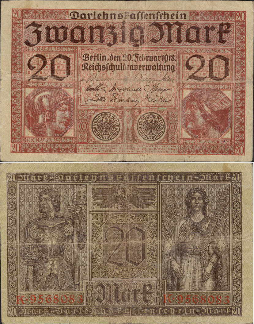 20 Mark; 20.2.1918; Grabowski DEU-62 (55.); Vs.: Minerva- und Merkurkopf; Rs.: Ritter und weibl. Gestalt mit Palmenzweig, Krieg und Frieden symbolisierend; Wz.: Wertzahl 20 in Ornamenten; Serien: A-Z |