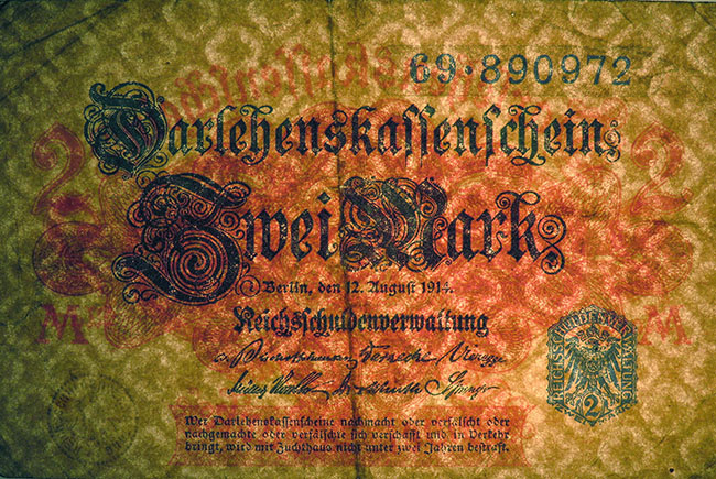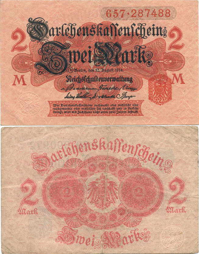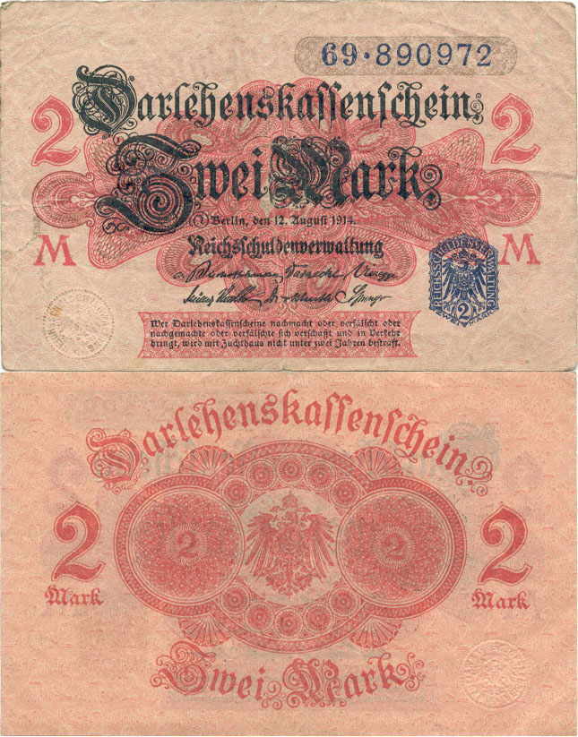 2 Mark; 12.8.1914; Grabowski DEU-59.b (52.b); Vs.: Text und Ornamente; Rs.: Reichsadler; Wz.: Kreuzblüten; mit Udr., Siegel rot; Serien: 175-514, 556-695 |