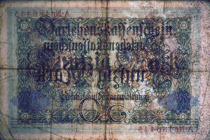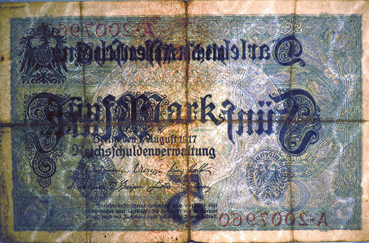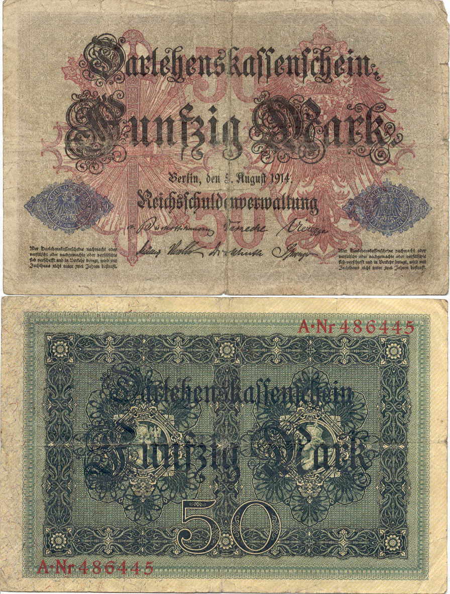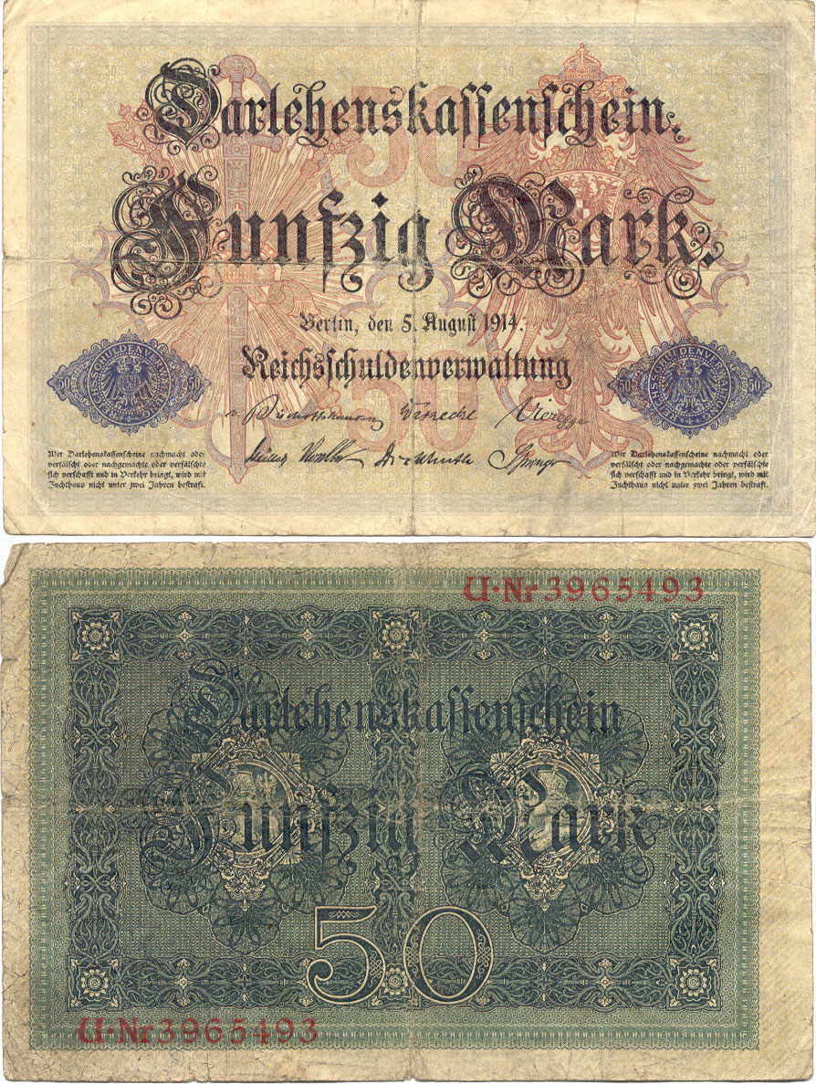 50 Mark; 5.8.1914; Grabowski DEU-56.a (50.a); Vs.: Text und Reichsadler sowie Schwerter im Udr.; Rs.: Germaniabrustbilder unter der Text; Wz.: Kaiserkrone und Lorbeerzweige; Kn. 6-stellig, braun; Serien: A-Z |