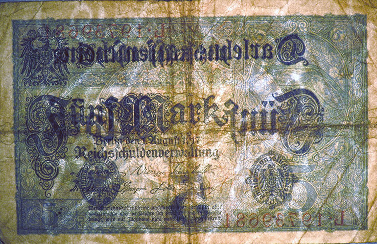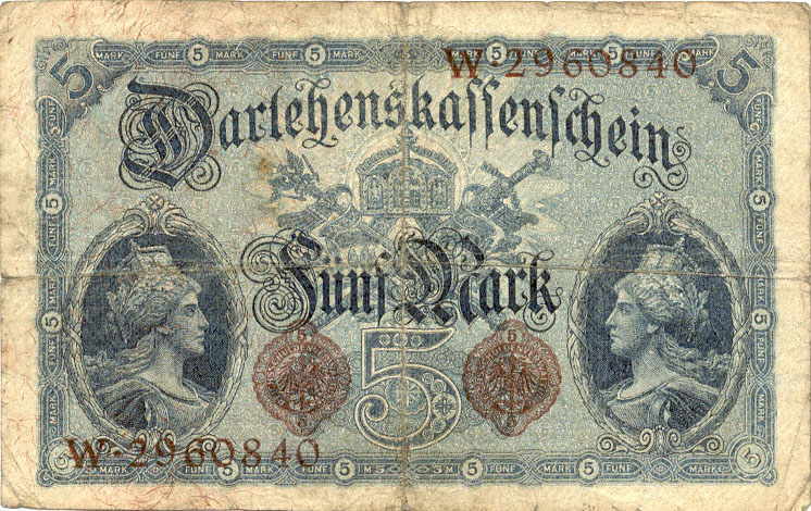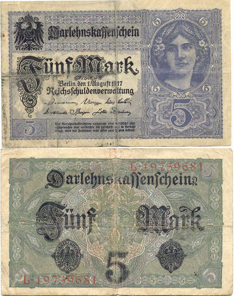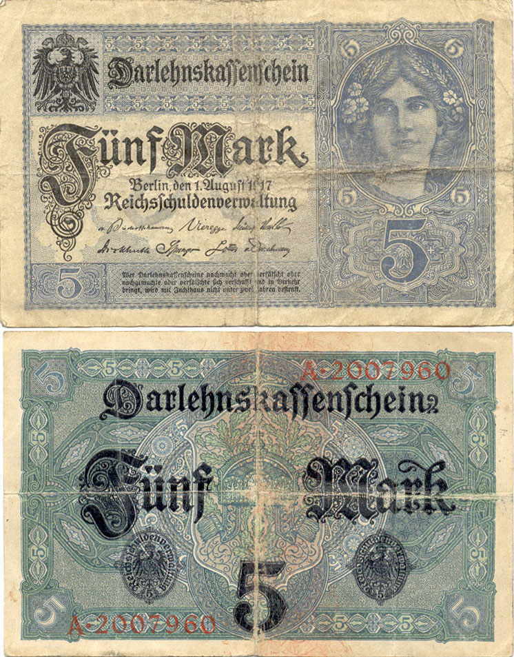 5 Mark; 5.8.1914; Grabowski DEU-54.b (48.b); Vs.: Text und Reichsadler im Udr.; Rs.: 2 Germaniabrustbilder gegeneinander; Wz.: Wertzahl 5 im Spiralband; Kn. 7-stellig, braun; Serien: A-Z |