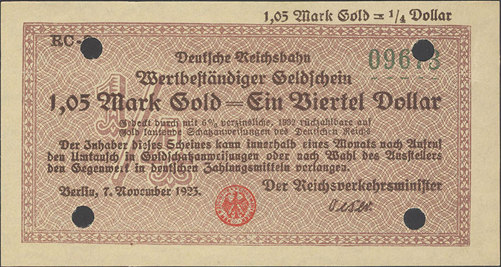 1,05 Mark Gold = 1/4 Dollar; 7. November 1923; Grabowski wie RVM-27 (002.36/S1036) nicht katalogisiert; Vs.: Text und Siegel auf Udr. mit Wertzahl "1/4"; Rs.: leer; Wz.: W-Muster; Kn 5-stellig, grün; lochentwertet |