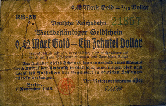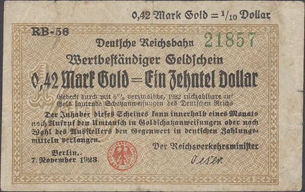 0,42 Mark Gold = 1/10 Dollar; 7. November 1923; Grabowski RVM-26.a (002.35/S1035); Vs.: Text und Siegel auf Udr. mit Wertzahl "1/10"; Rs.: leer; Wz.: W-Kreuz-Muster; Kn 5-stellig, grün |