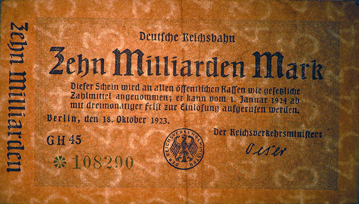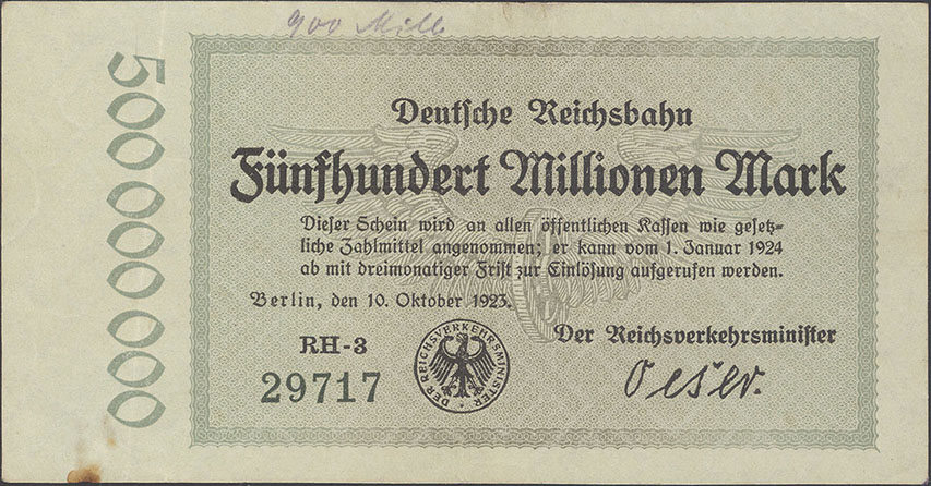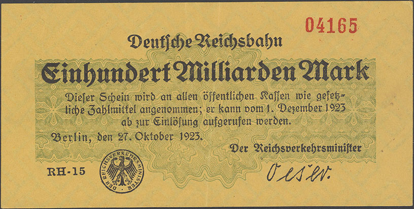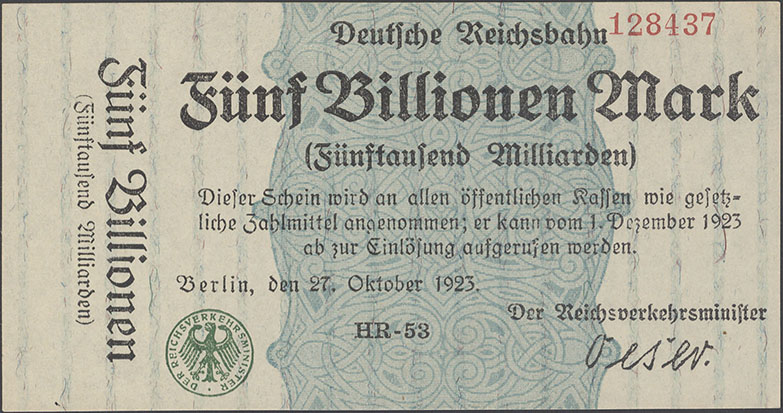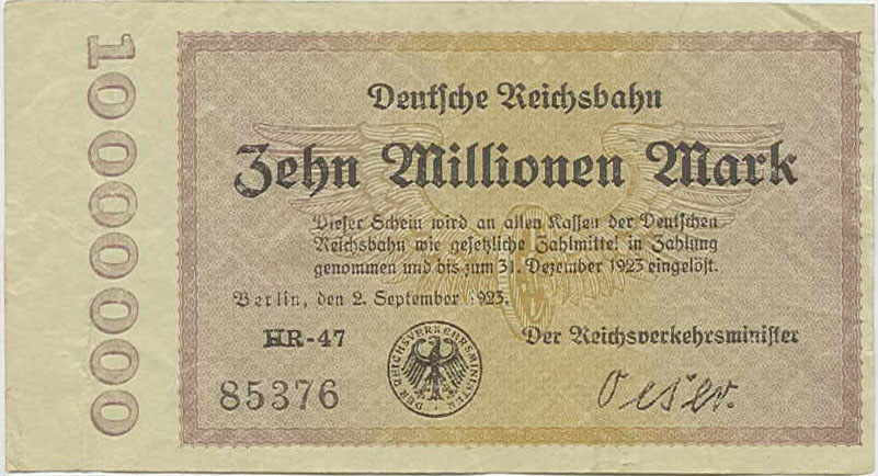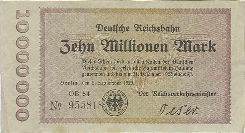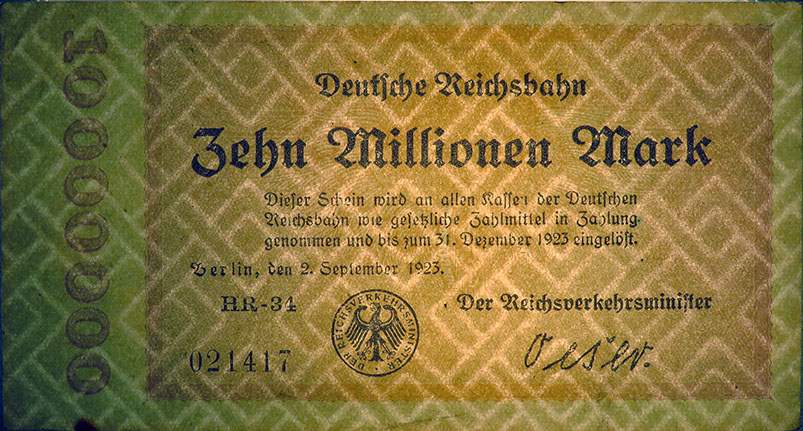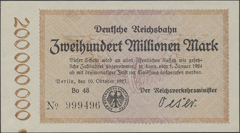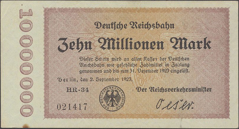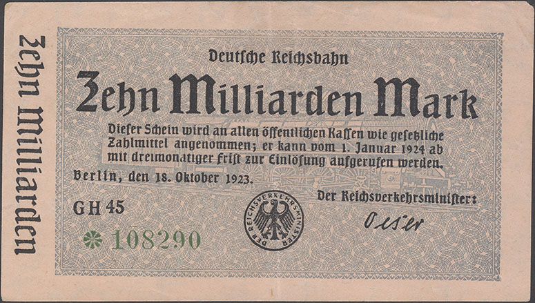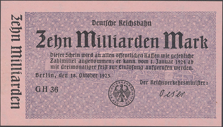 10 Milliarden Mark; 18. Oktober 1923; nicht katalogisiert, sonst wie Grabowski RVM-11 (002.18/S1021); Vs.: Text und Siegel auf Udr. mit Dampflokomotive; Rs.: leer; Wz.: "43"; Kn grün, 6-stellig |