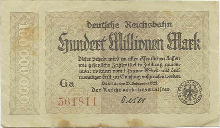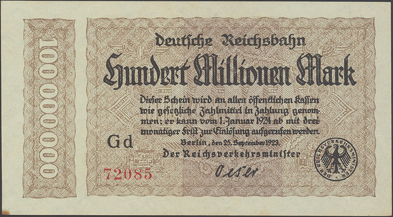 100 Millionen Mark; 25. September 1923); Grabowski RVM-7.f (002.13/S1017.f; Rs.: leer; Wz.: verschlungene Quardate; Kn 6-stellig, Serien: Ga-Ia, Ka-Ma, Gb, Ib, Kb-Mb |