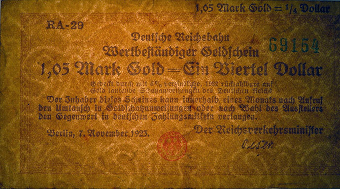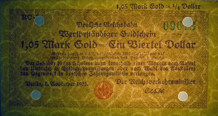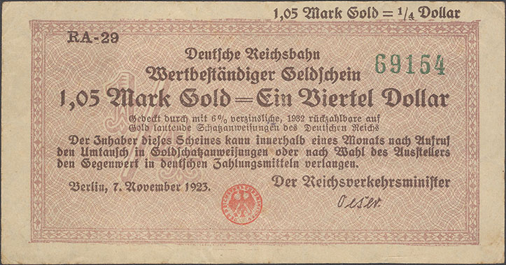 1,05 Mark Gold = 1/4 Dollar; 23. Oktober 1923; Grabowski RVM-24 (002.33/S1033); Vs.: Text und Siegel auf Udr. mit Wertzahl "25"; Rs.: leer; Wz.: verschlungene Quadrate; Kn 6-stellig, schwarz |