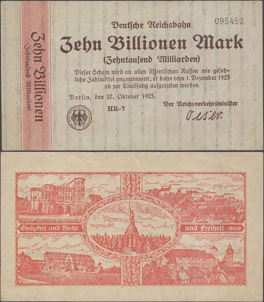 10 Billionen Mark; 27. Oktober 1923; Grabowski RVM-17 (002.26/S1030); Vs.: Text und Siegel auf linkem Randornament; Rs.: links oben: Porta Nigra in Trier, rechts oben: Festung Ehrenbreitstein, Mitte im ovalen Eichenlaubrahmen: Hermannsdenkmal Teutoburger Wald, links unten: Kaiserpfalz Goslar, rechts unten: Nürnberger Burg, Mitte: Spruchband "Einigkeit und Recht und Freiheit"; ohne Wz.; Kn 6-stellig, dunkelbraun |